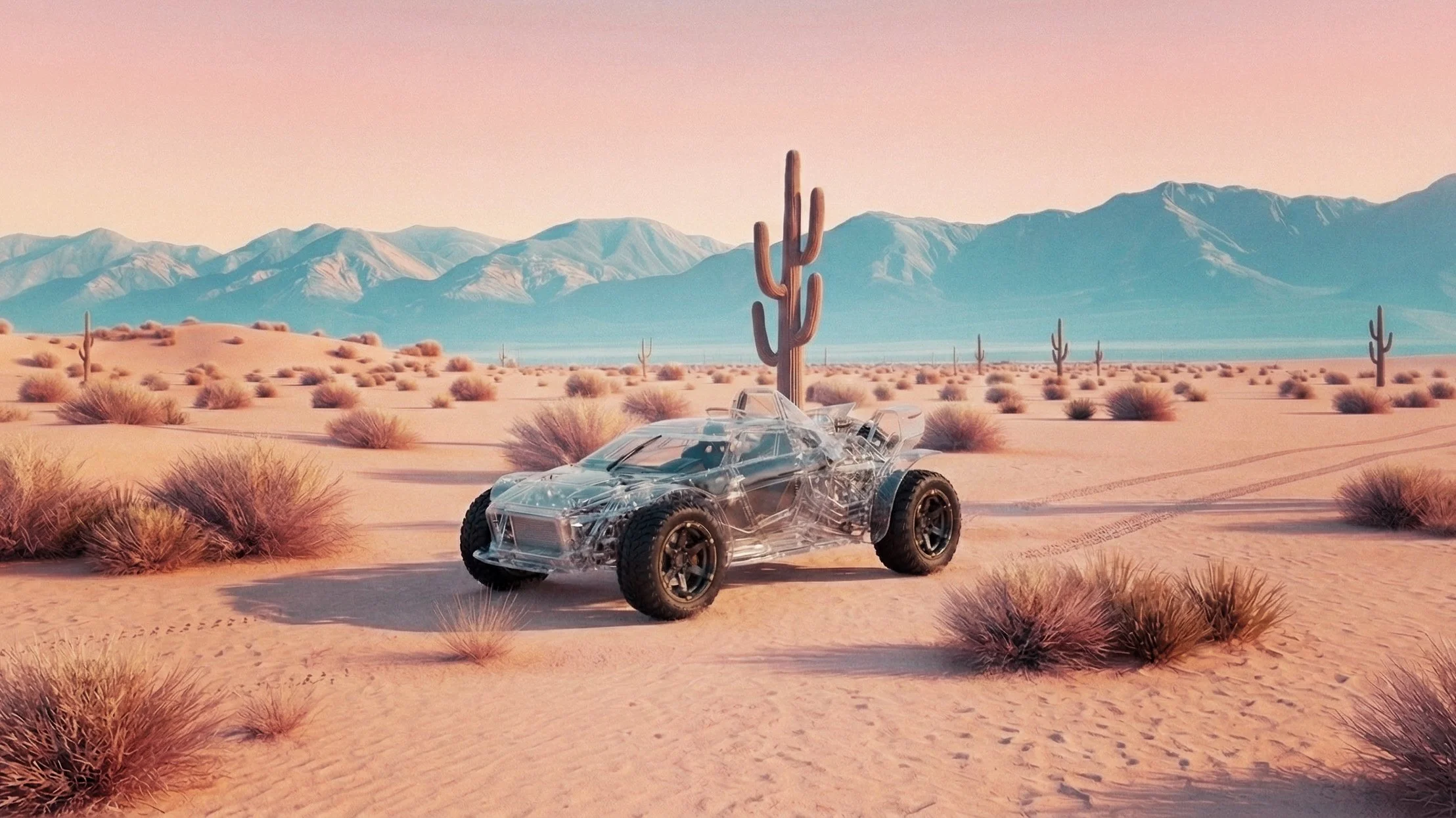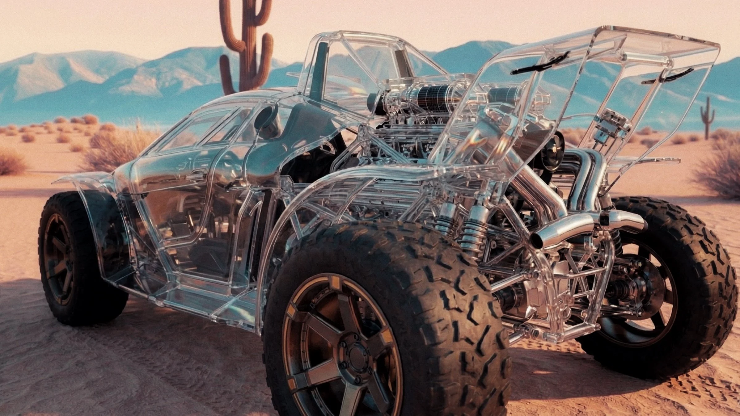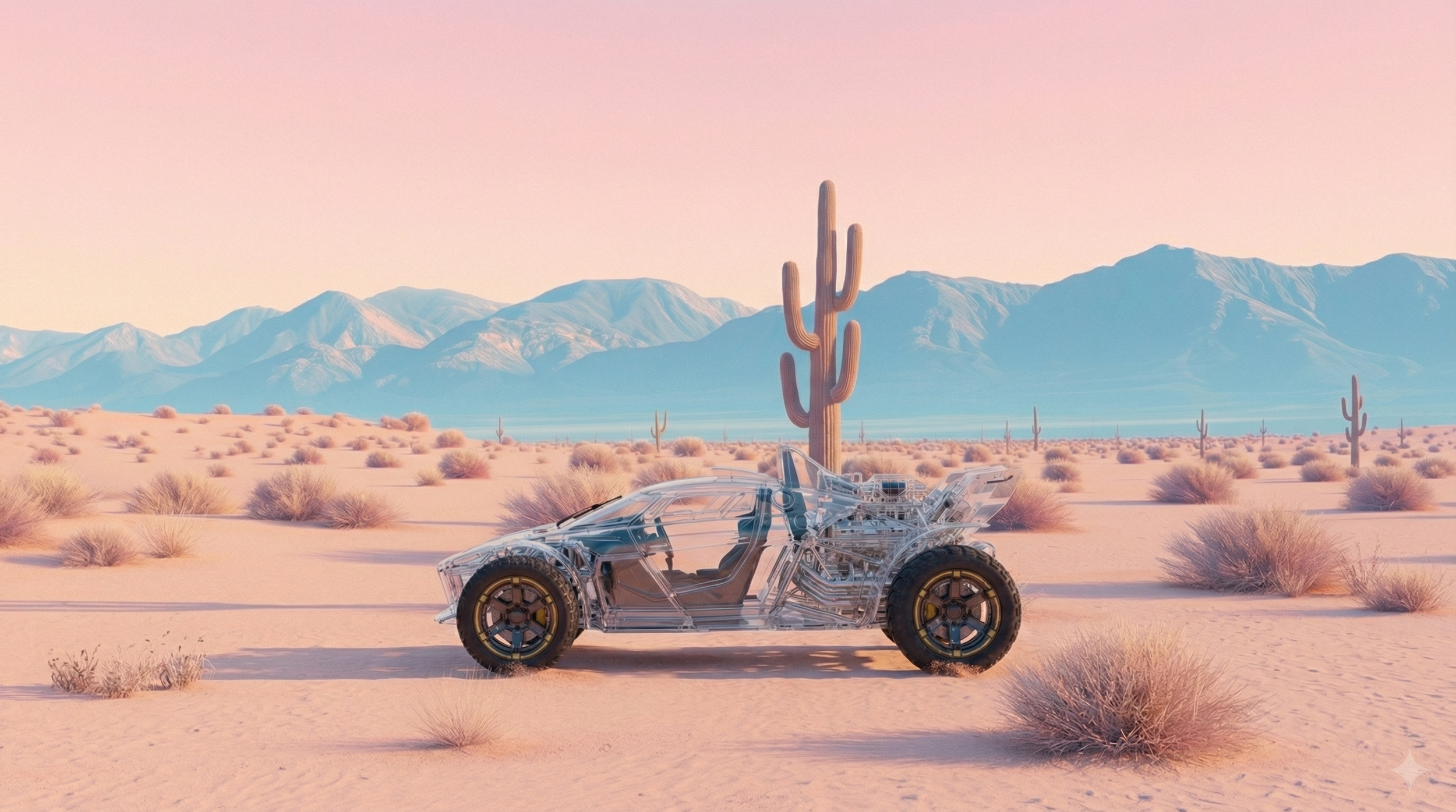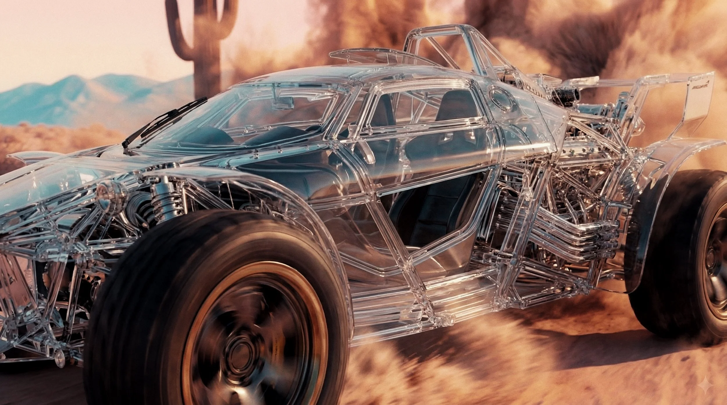This creation was born from a vivid dream, a crystal car racing through a vast desert landscape, framed by towering cacti in the background. Inspired by a surreal adventure, I crafted this scene using AI, blending dreamlike wonder with intricate realism, as if the car and desert are one.