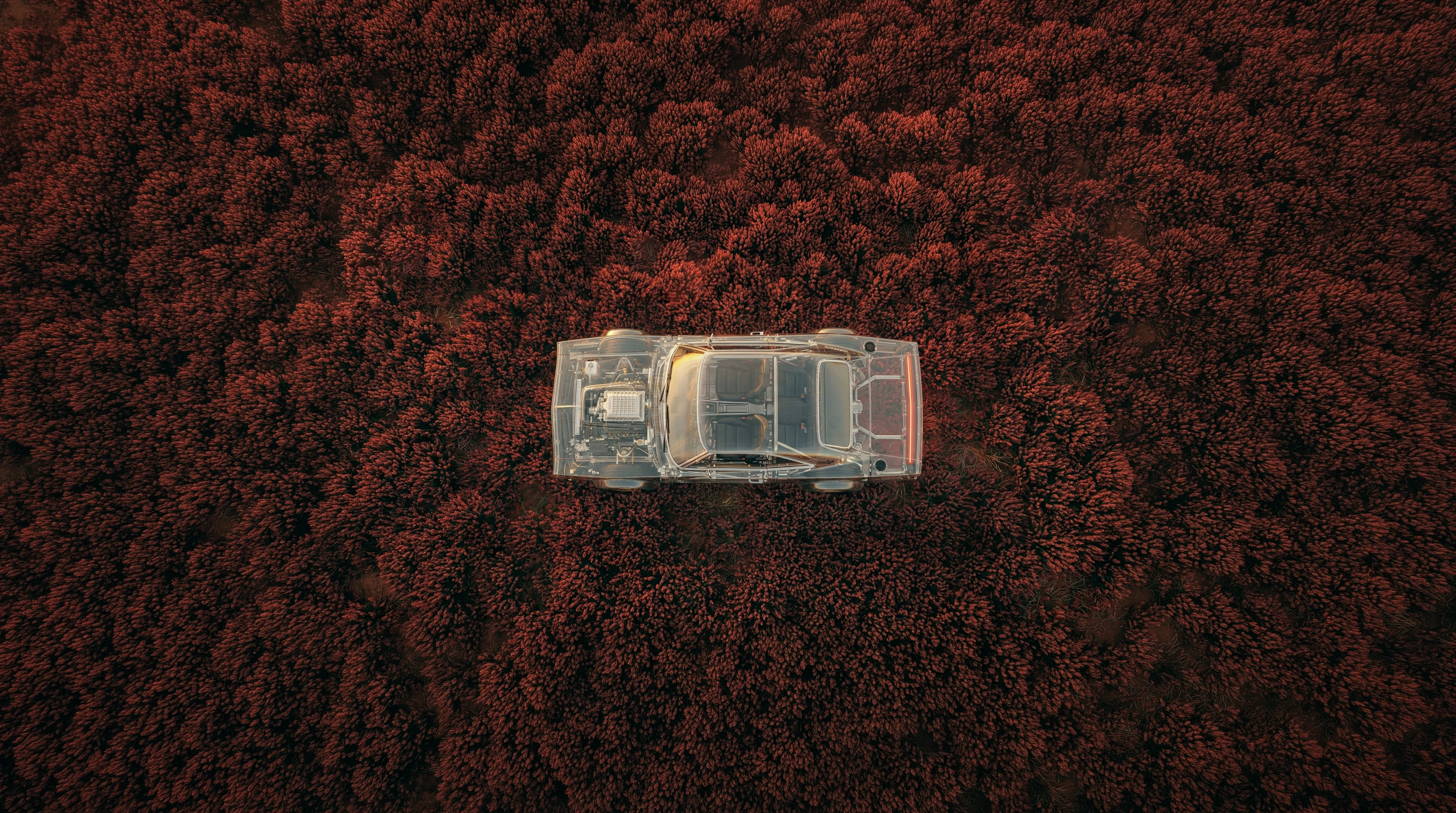 This crystal car travels through a vast world of red flowers, with blossoms stretching as far as the eye can see. Inspired by a vision of boundless beauty, this creation invites you to see the car exploring a field alive with color and motion.
