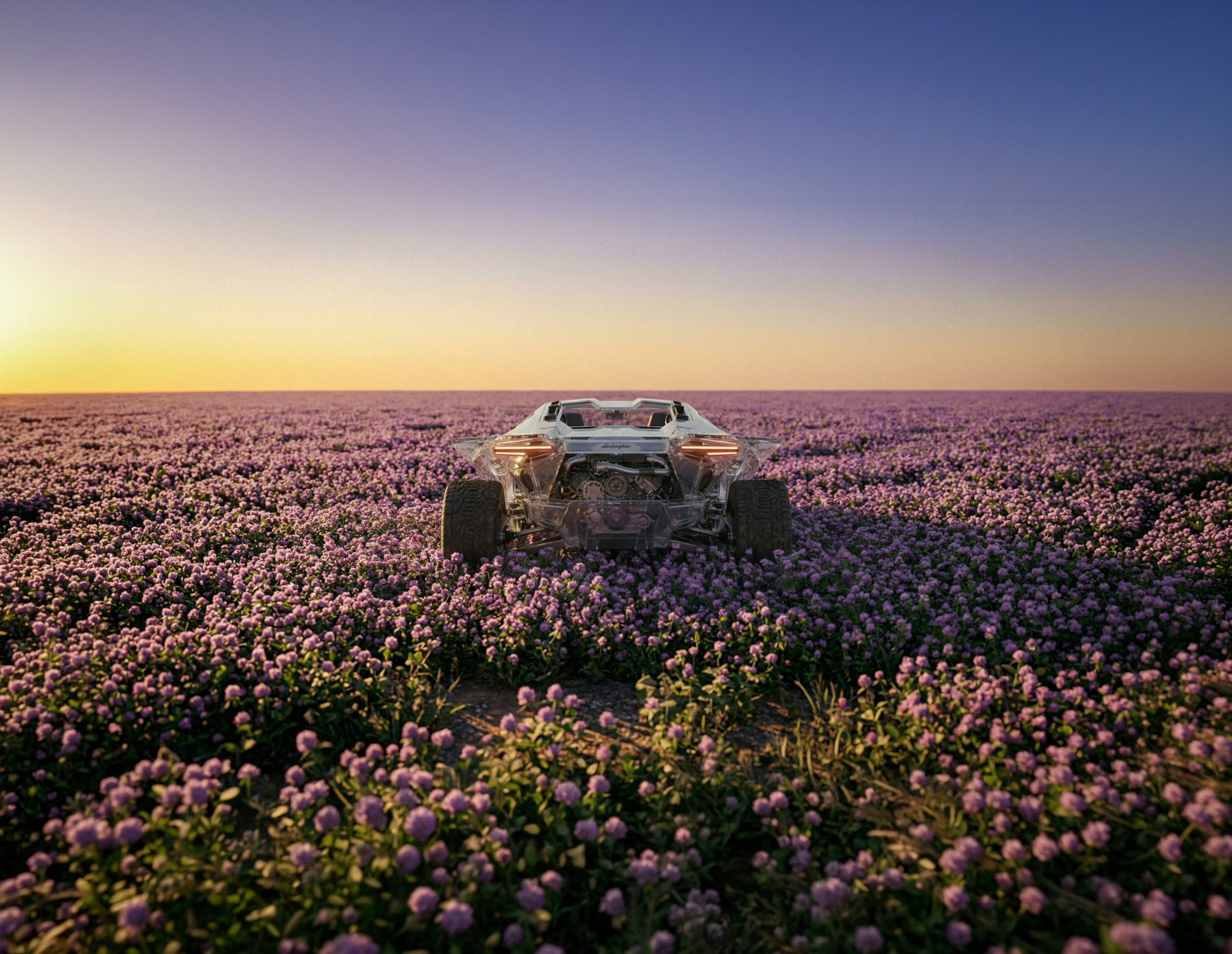 Drawing inspiration from the Lamborghini, this all-terrain crystal car embodies both rugged power and serene elegance. Surrounded by a calm field of purple flowers under a moody, golden-hour sky, it captures a perfect balance between strength and beauty—a journey of bold adventure wrapped in romantic tranquility.