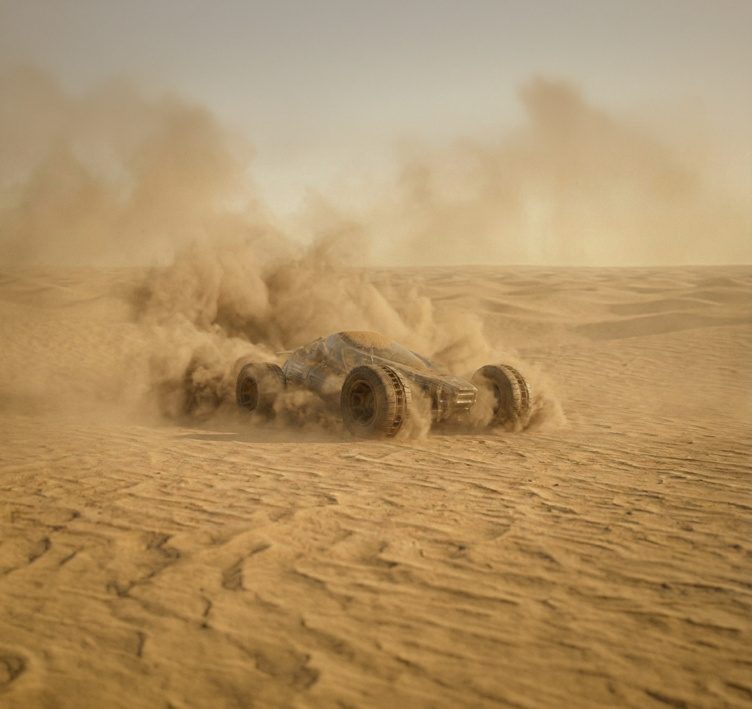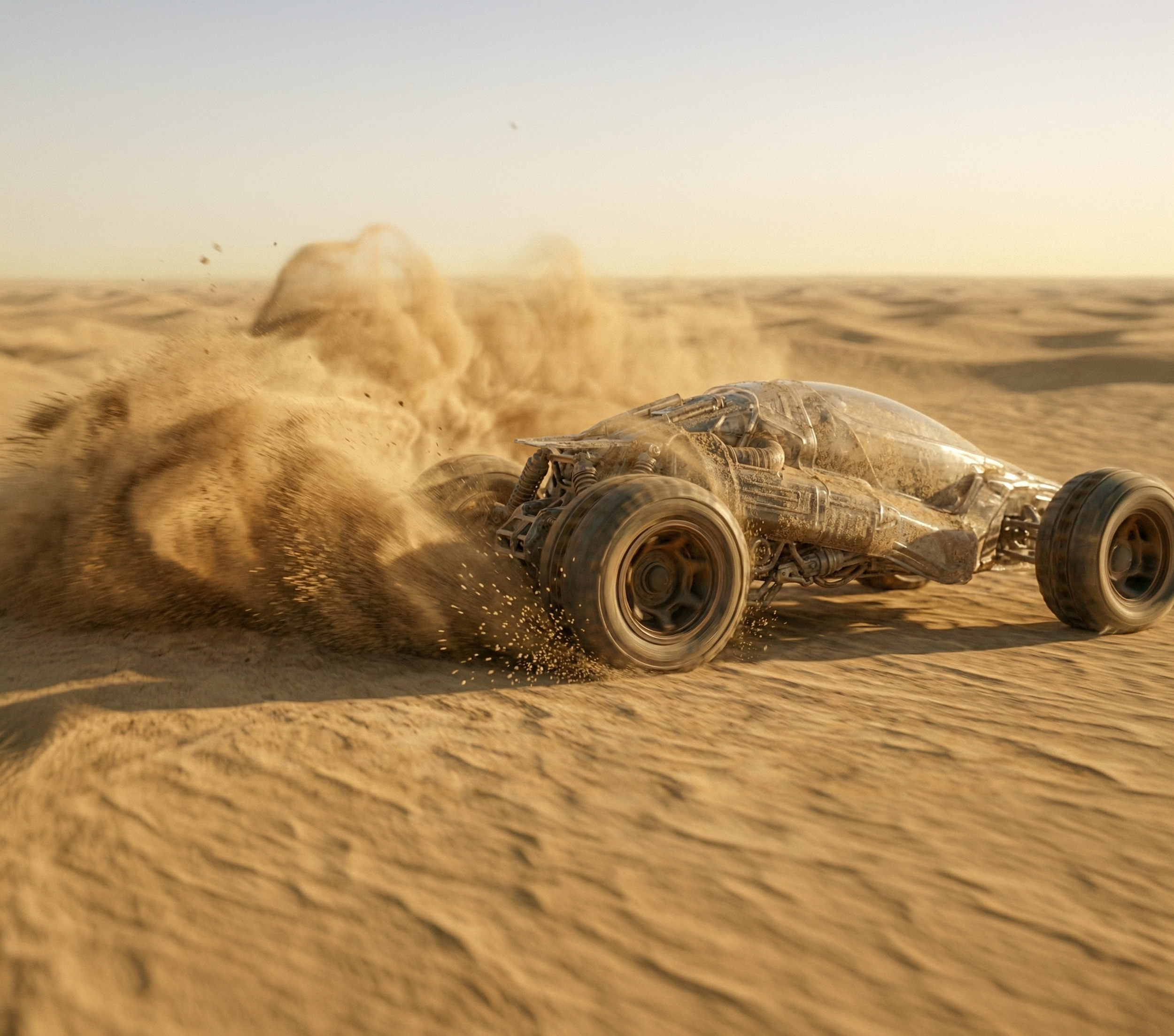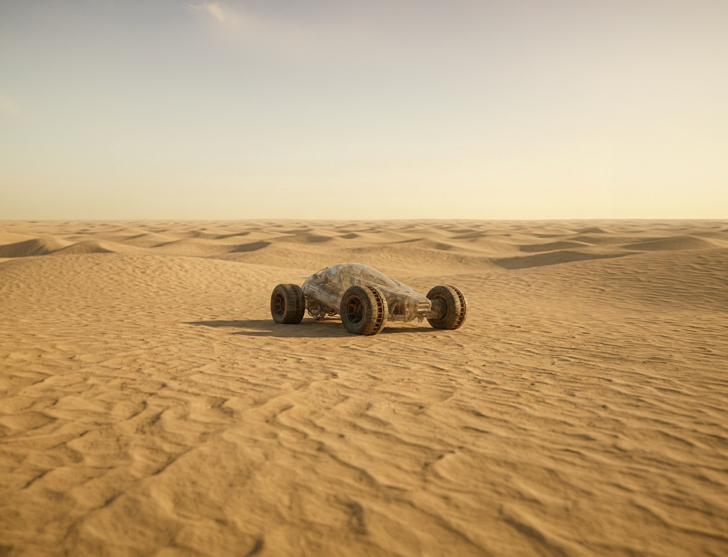 This compact, high-speed sand vehicle is born from pure imagination. Designed with thick, rugged wheels to conquer endless dunes, its sleek, futuristic shape and bold lines are balanced by a lightweight frame and a minimalist interior. Every detail from the powerful engine to the sand-gripping rims reflects boundless creativity, built to race through surreal deserts.