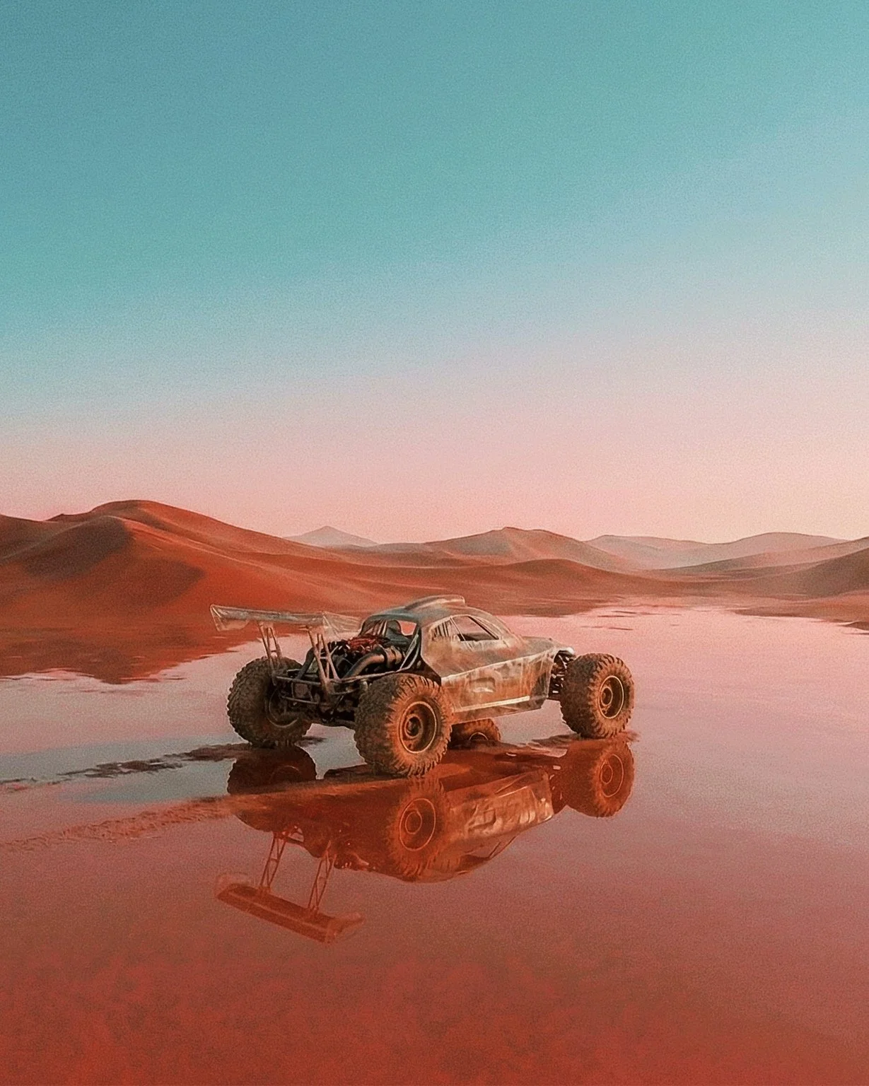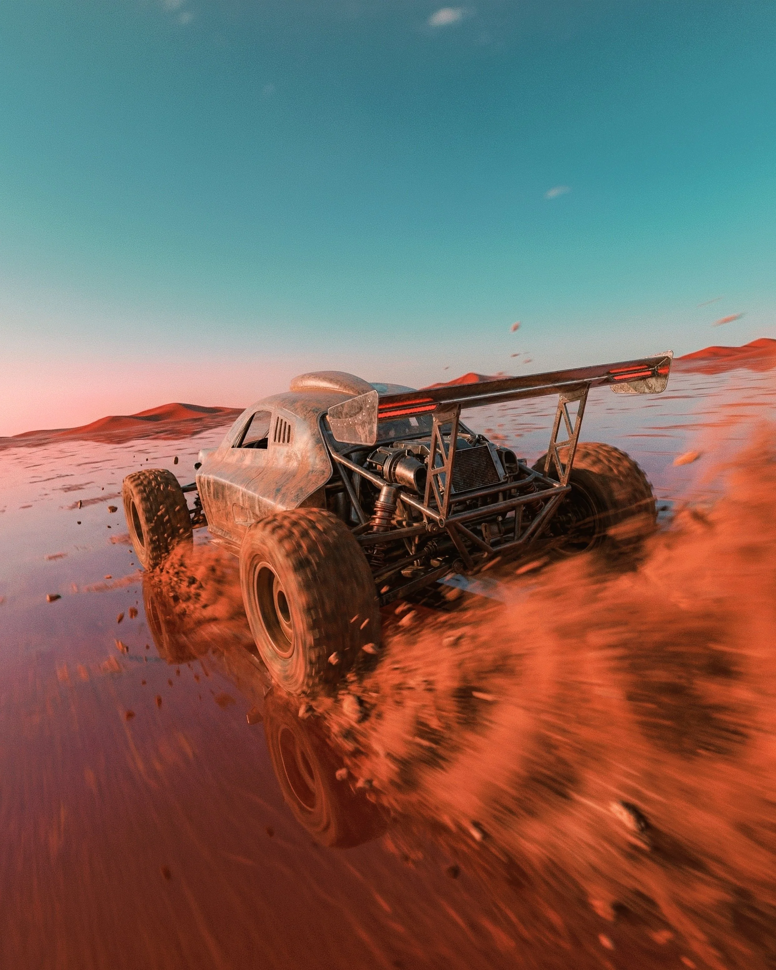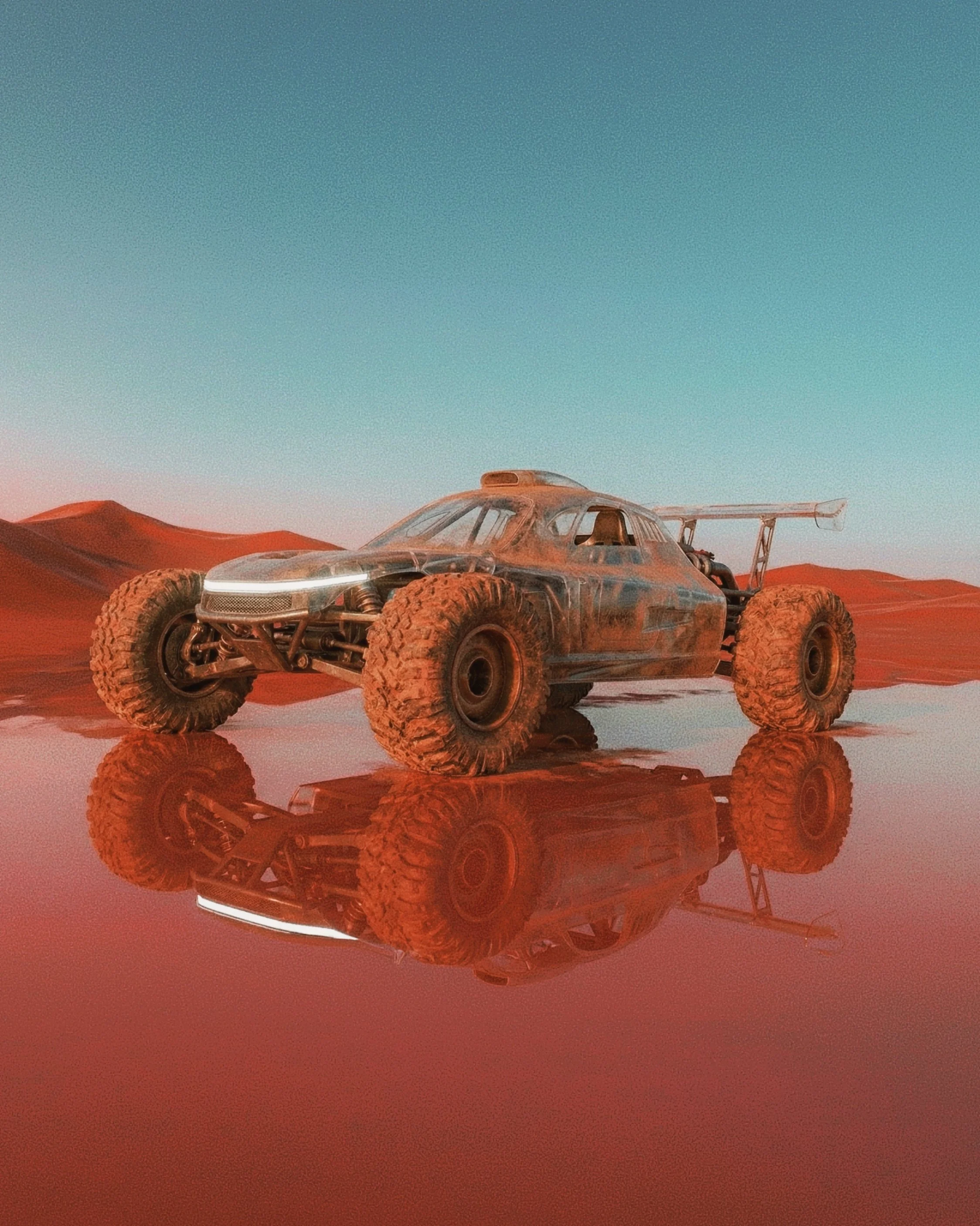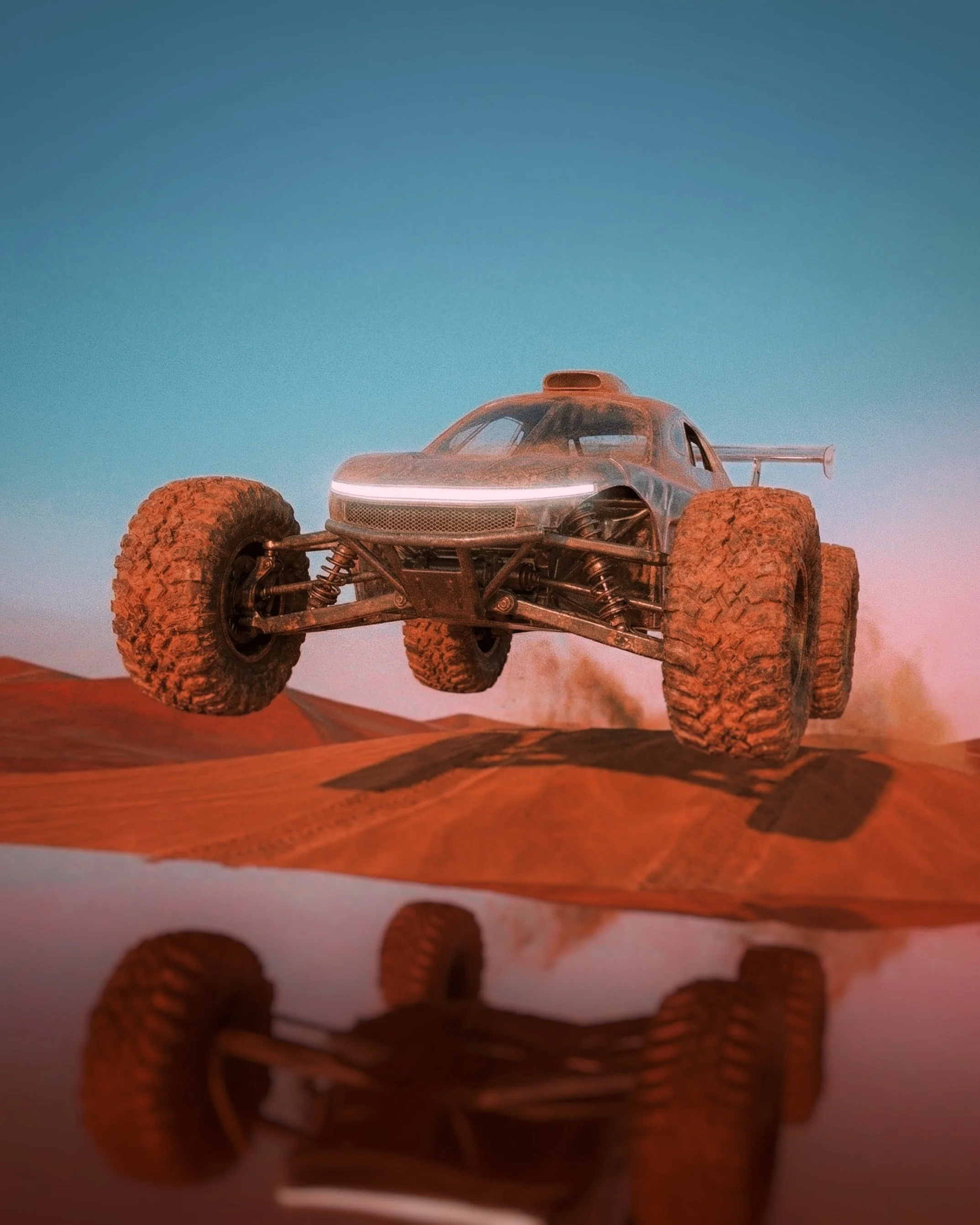 This compact, high-speed sand vehicle is born from pure imagination. Designed with thick, rugged wheels to conquer endless dunes, its sleek, futuristic shape and bold lines are balanced by a lightweight frame and a minimalist interior. Every detail from the powerful engine to the sand-gripping rims reflects boundless creativity, built to race through surreal deserts.