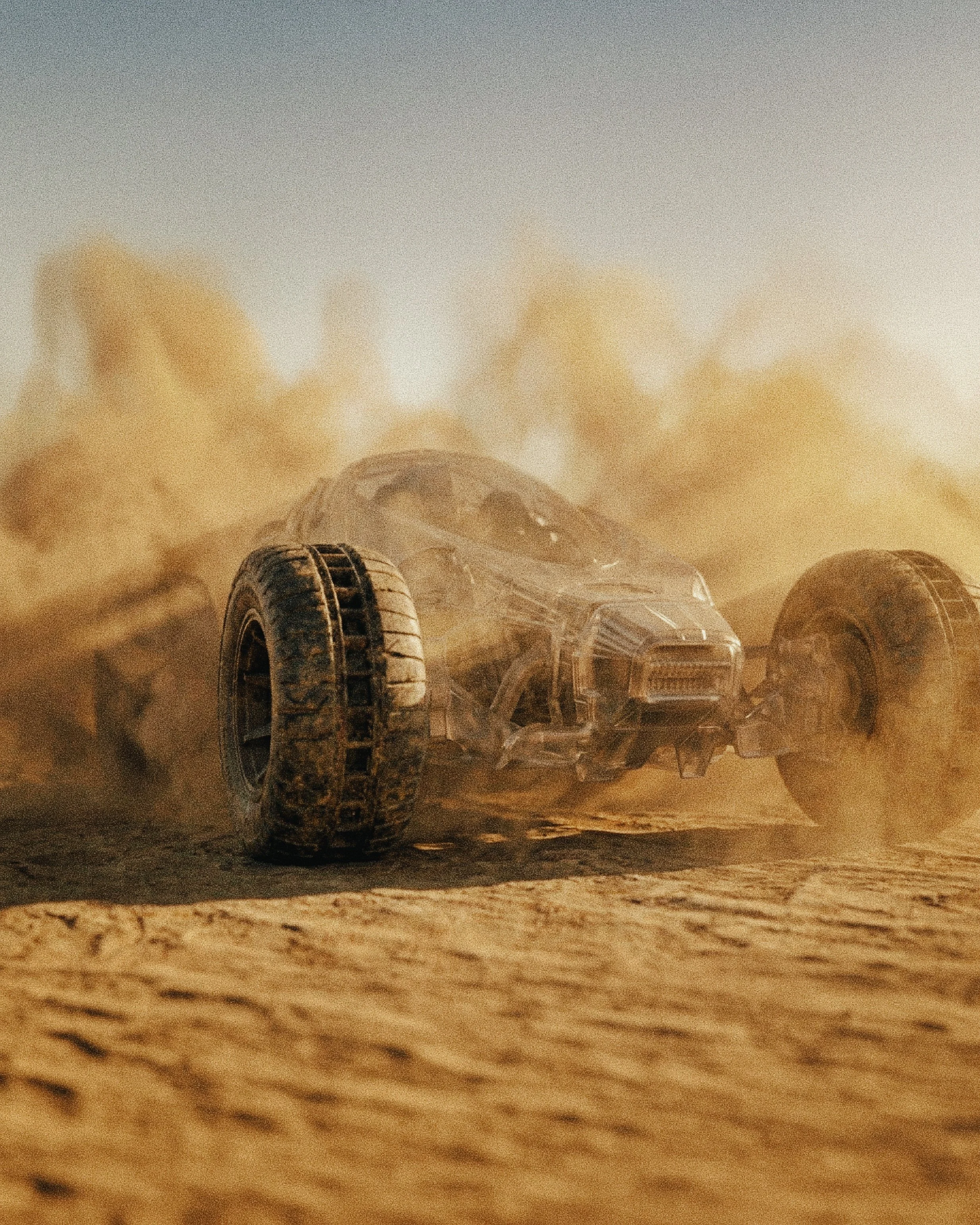 This crystal car is set in a world sculpted from clay, where vibrant orange hues dominate every surface. Built with thick, rugged wheels, it powers effortlessly across the clay terrain, a symbol of strength and resilience. Every detail exudes bold energy, designed to conquer even the toughest ground.