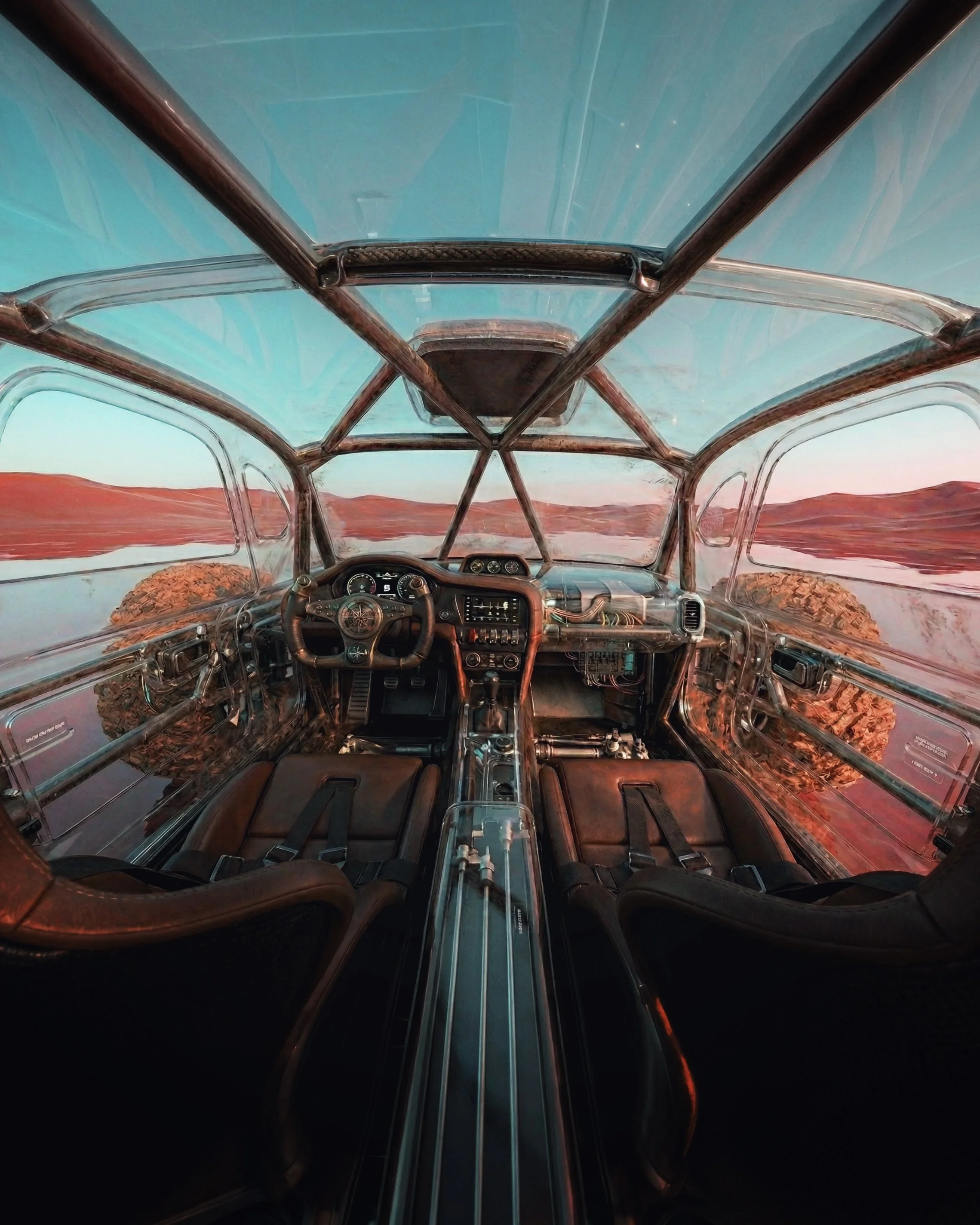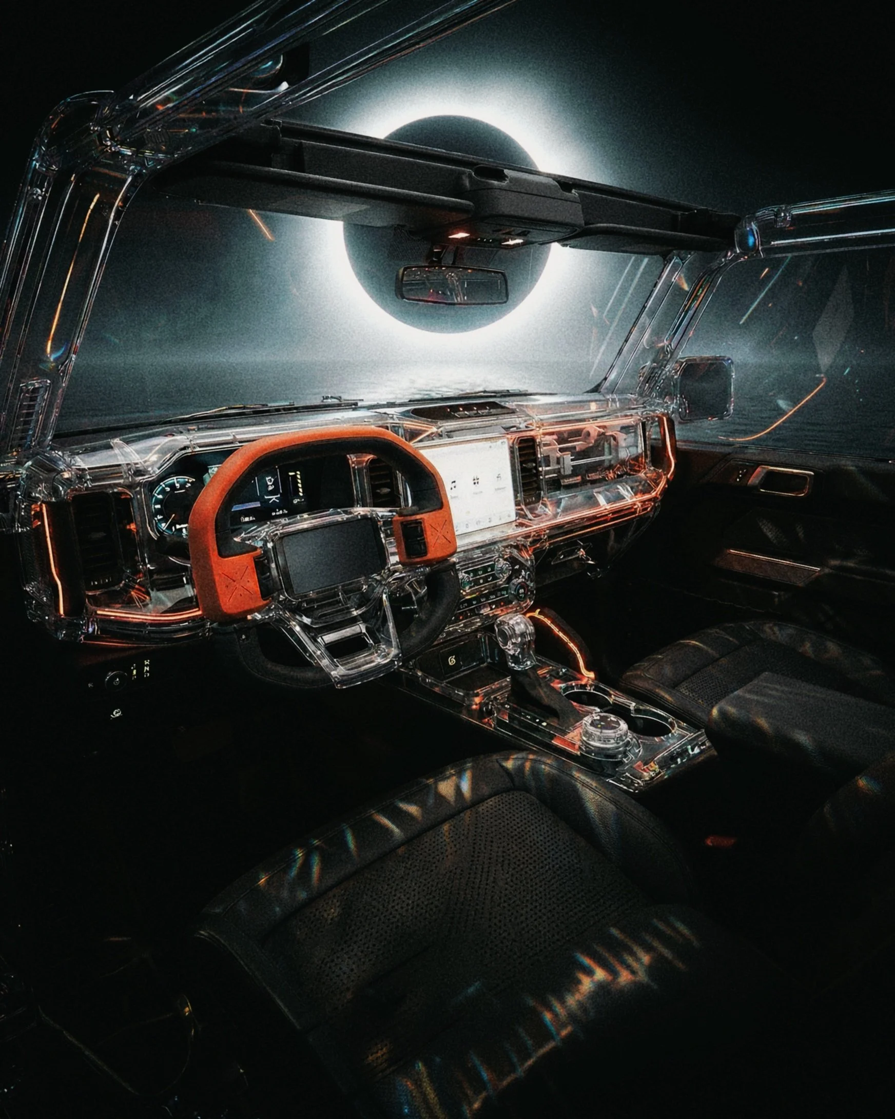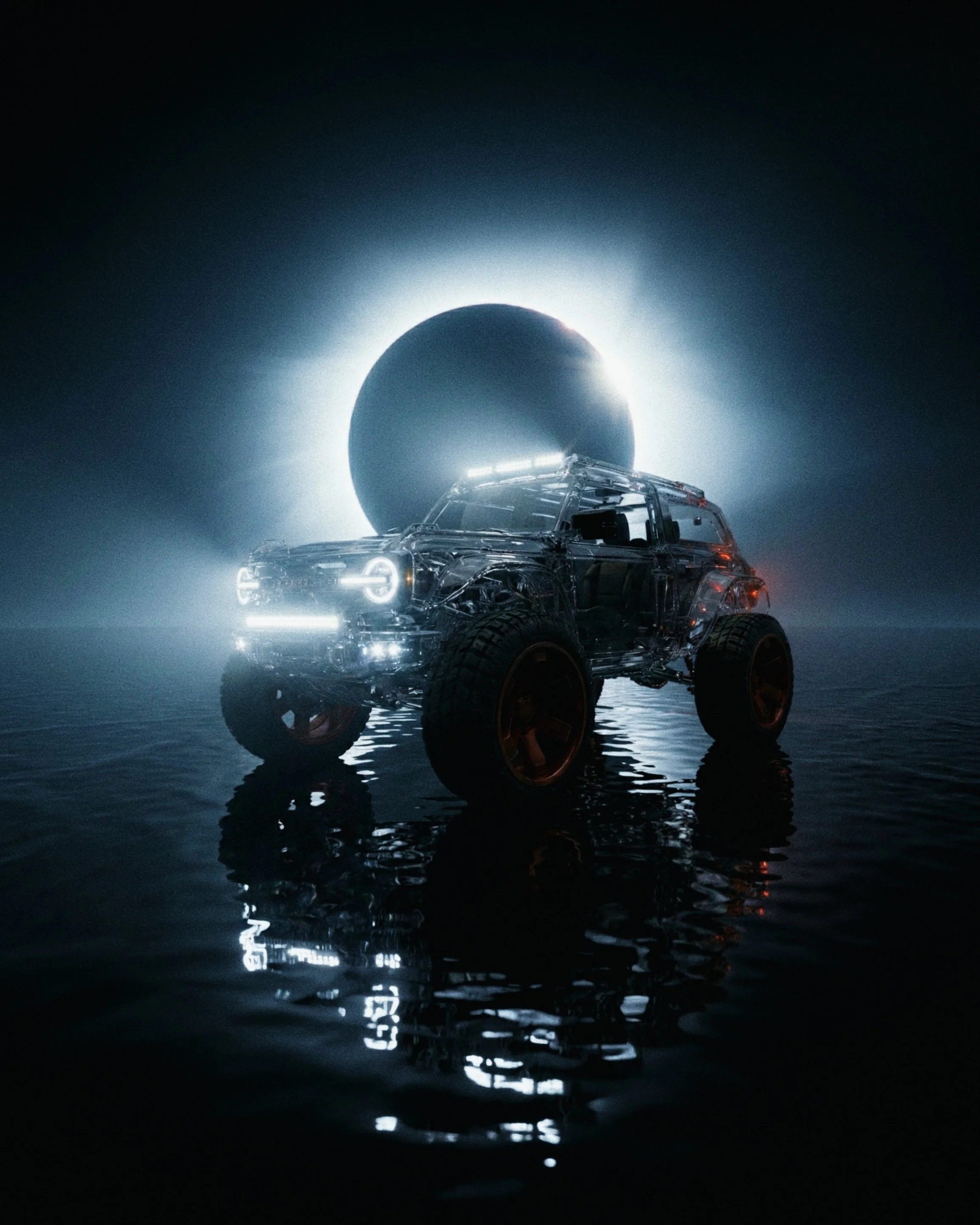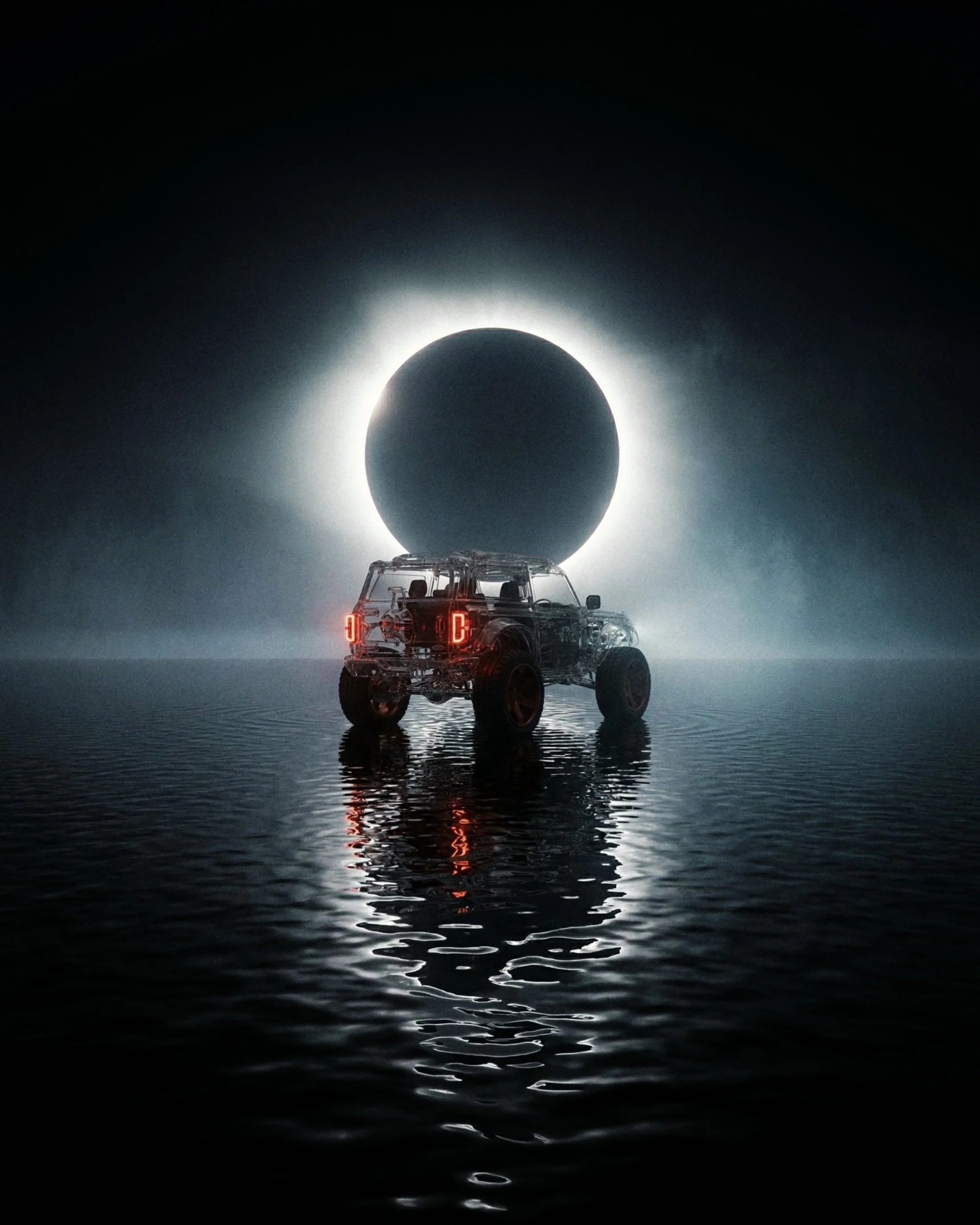 Born from imagination, this crystal car glides on endless water beneath a timeless solar eclipse. I began exploring interior design here, adding rich colors, textures, and new materials. The result is a delicate balance of calm beauty and subtle unease.