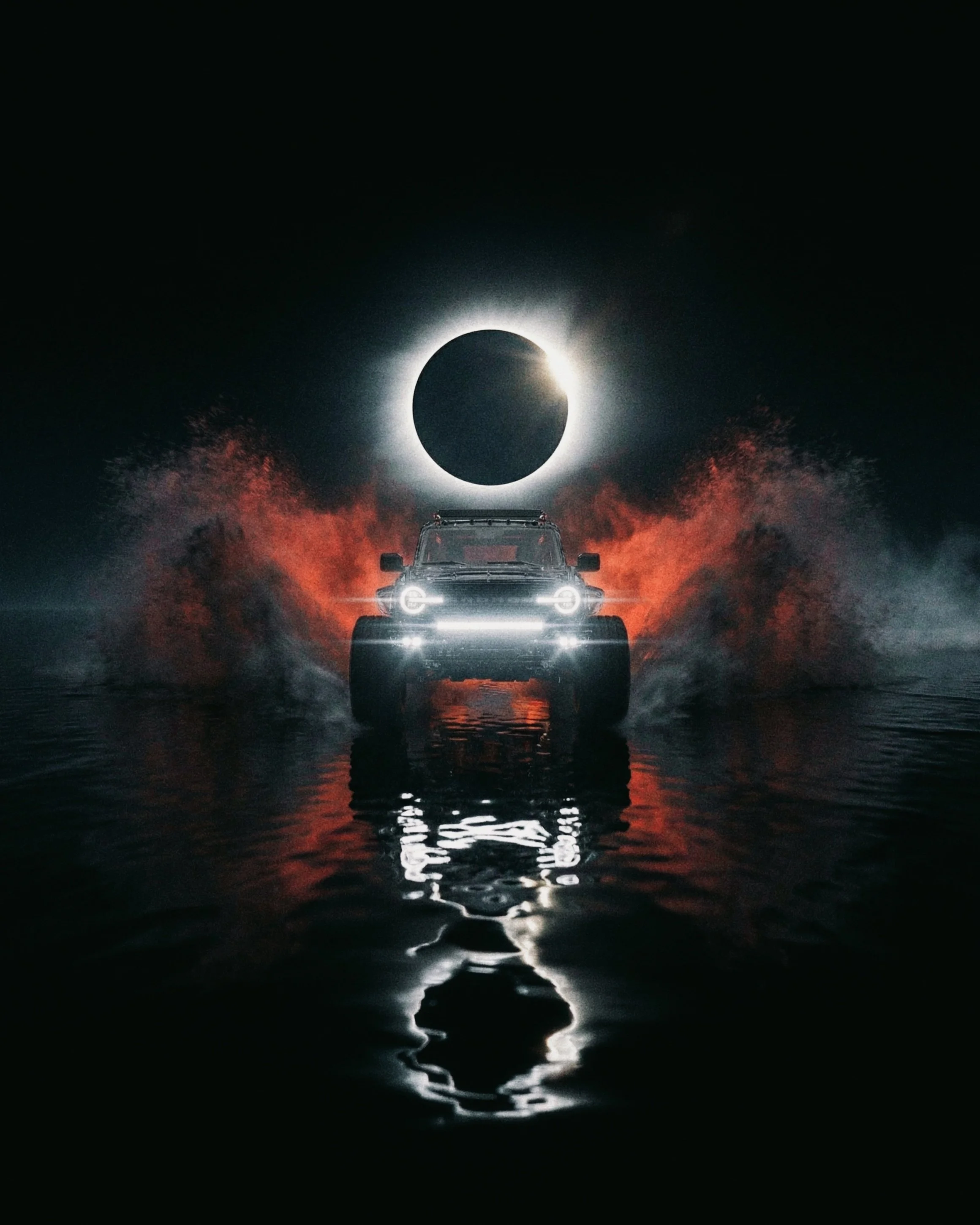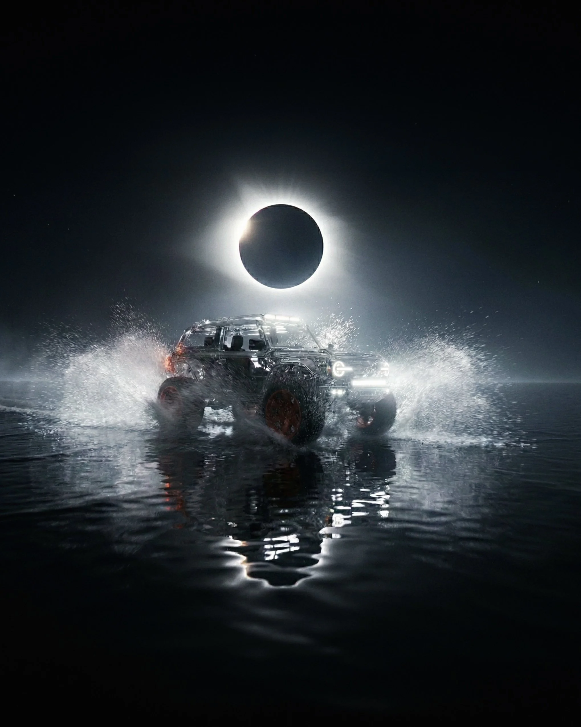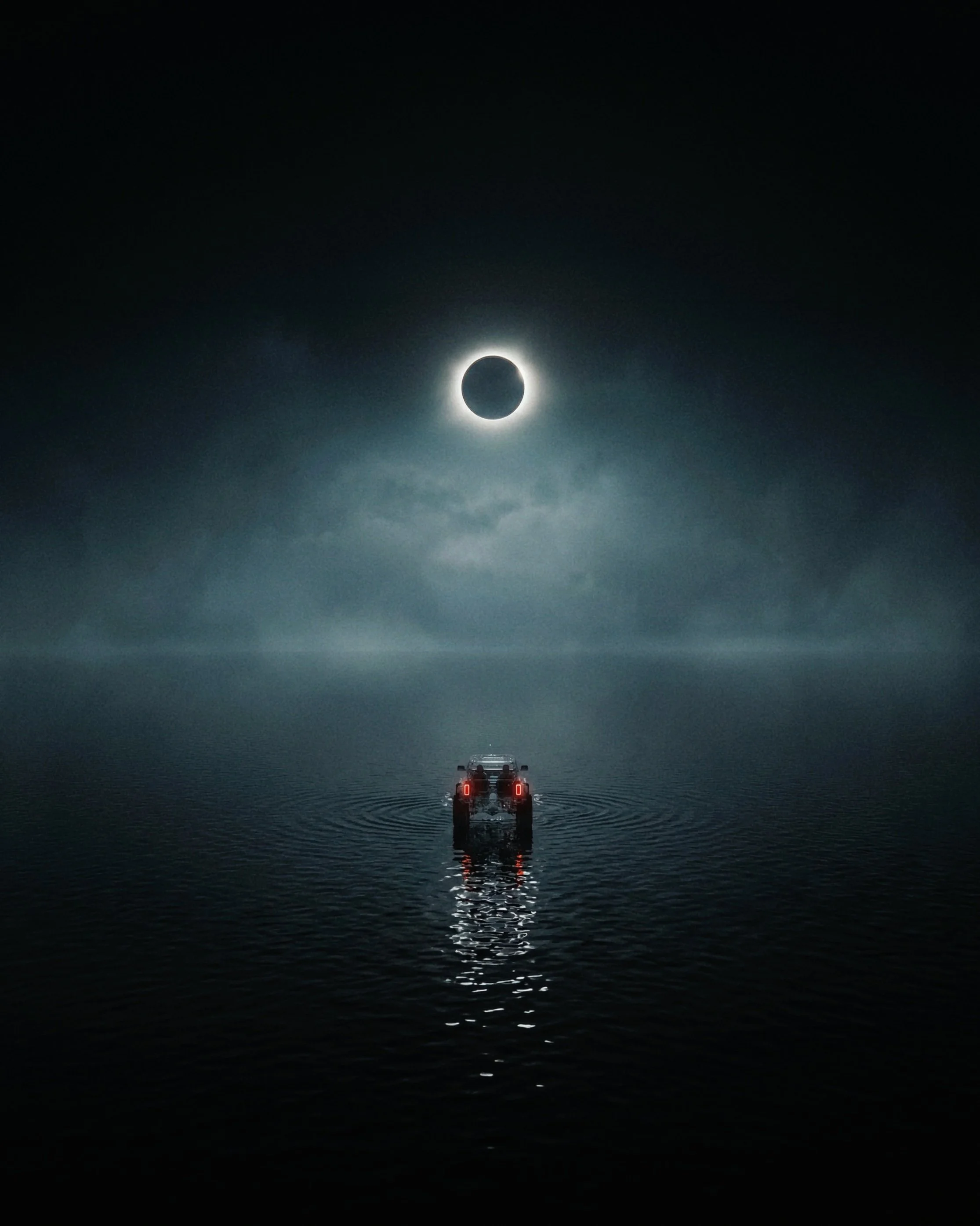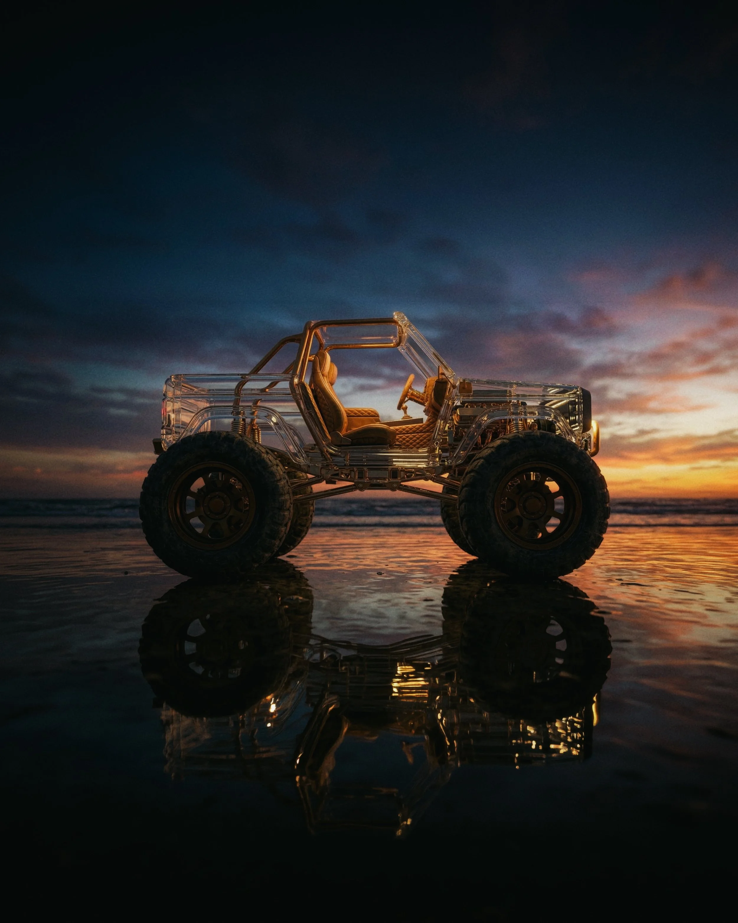 Born from imagination, this crystal car glides on endless water beneath a timeless solar eclipse. I began exploring interior design here, adding rich colors, textures, and new materials. The result is a delicate balance of calm beauty and subtle unease.