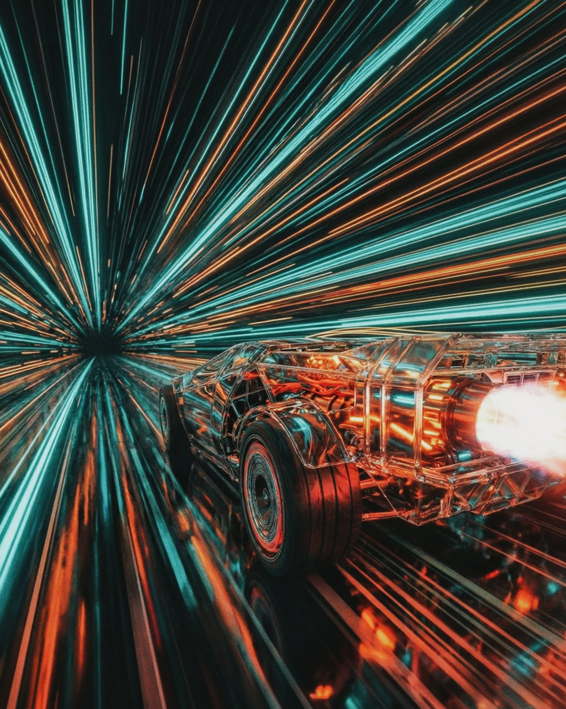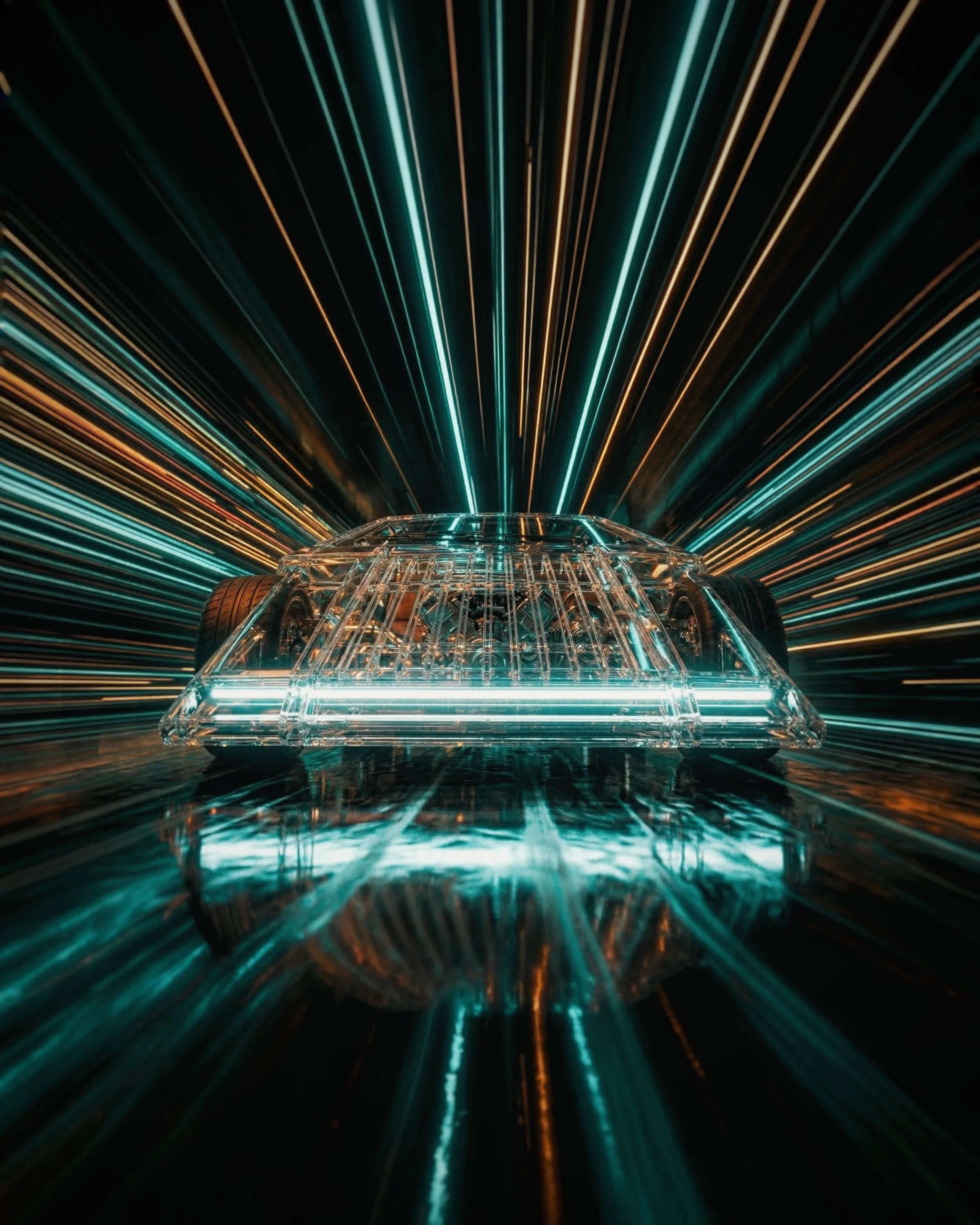 This car is pure speed, designed to shatter the limits of light itself. Every detail was crafted to capture the illusion of stretching light and hyper-real reflections. As it races, it blurs boundaries—each surface, each line, reflecting the infinite rush toward light speed.