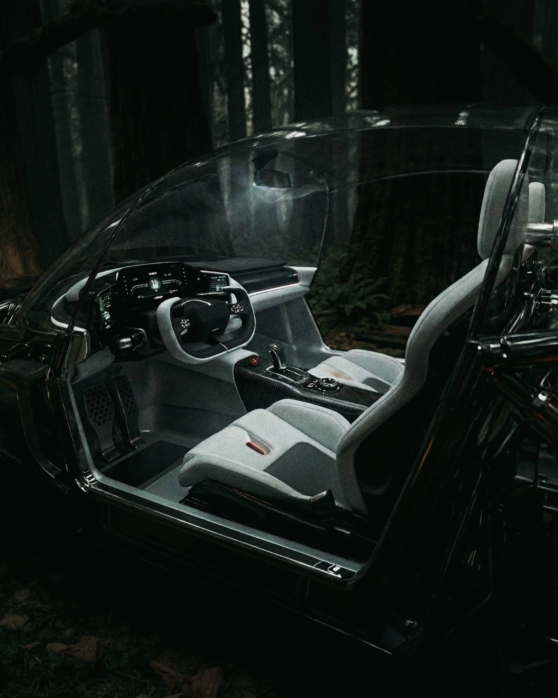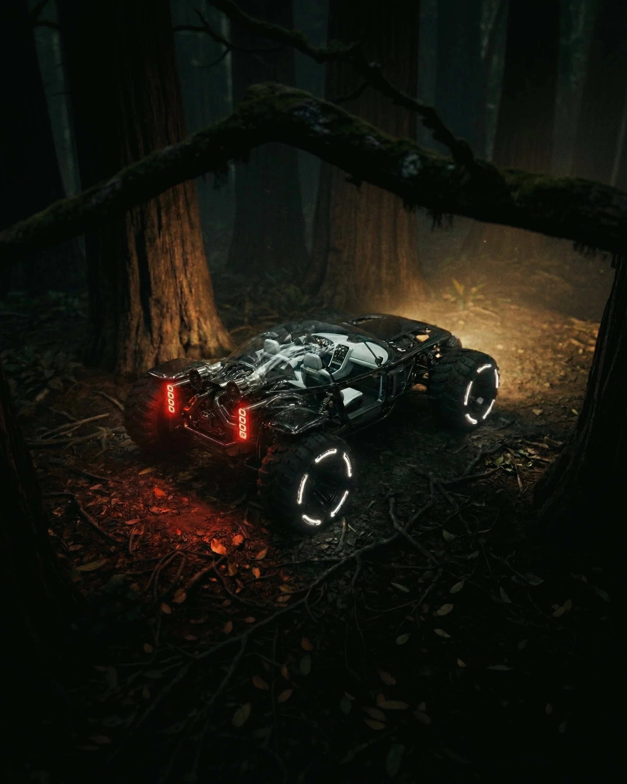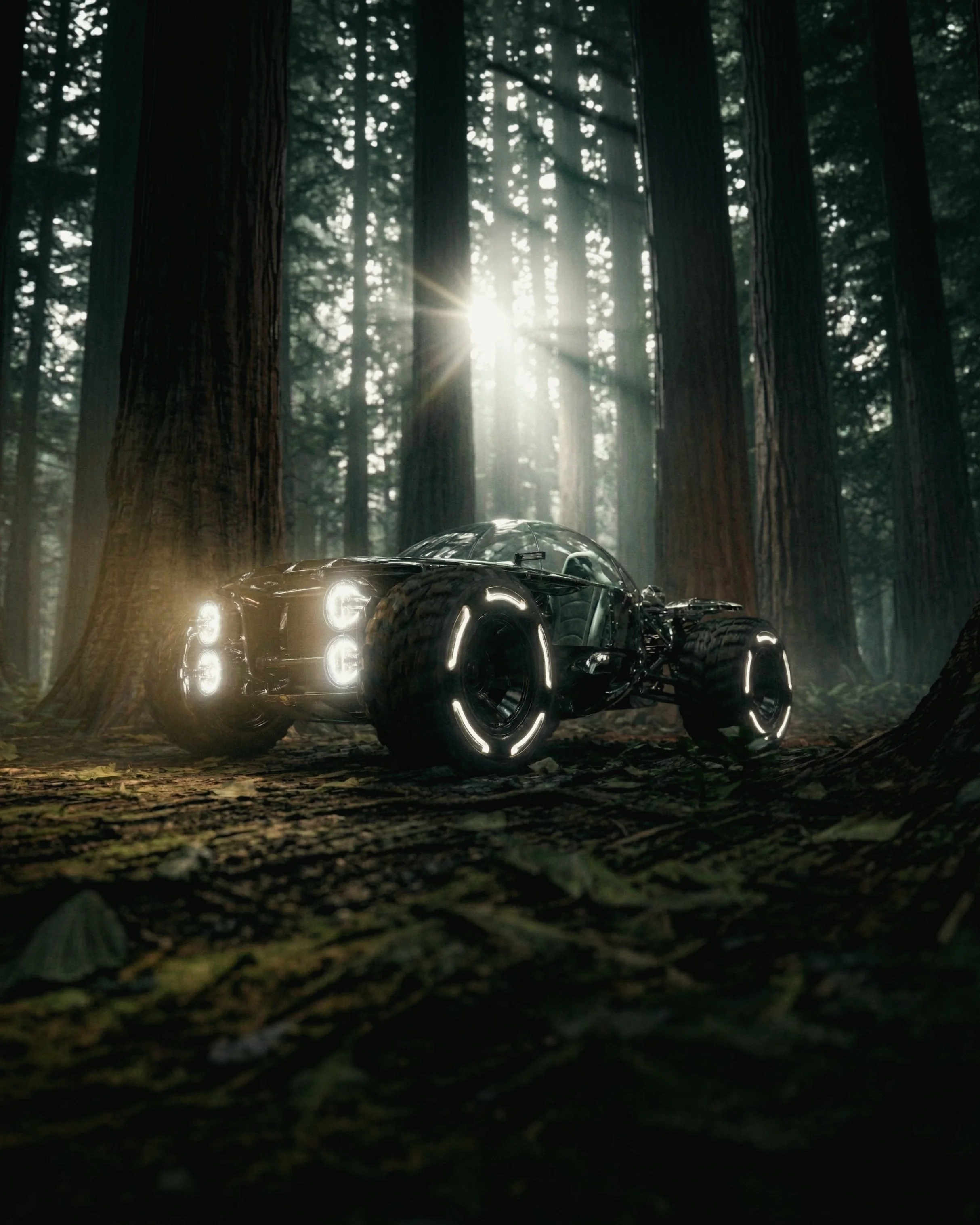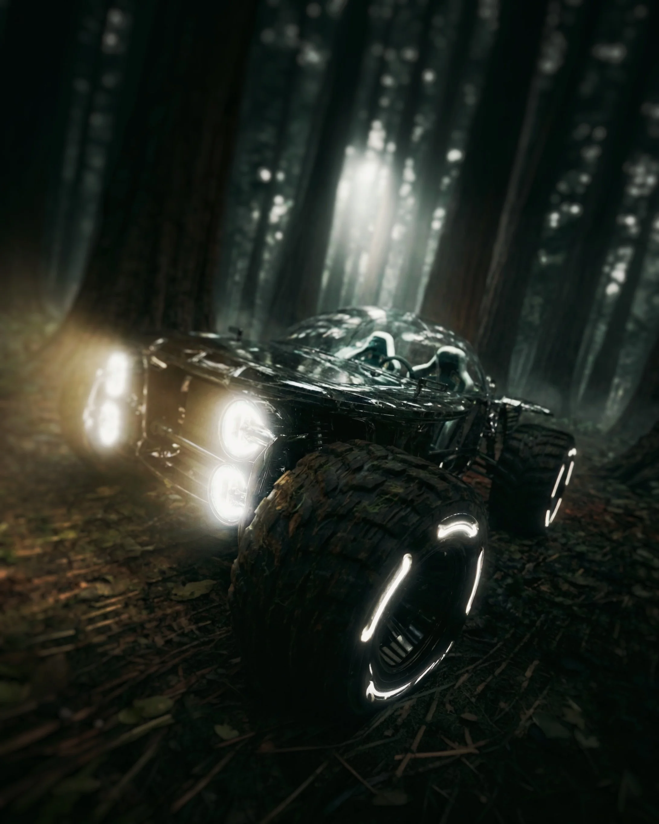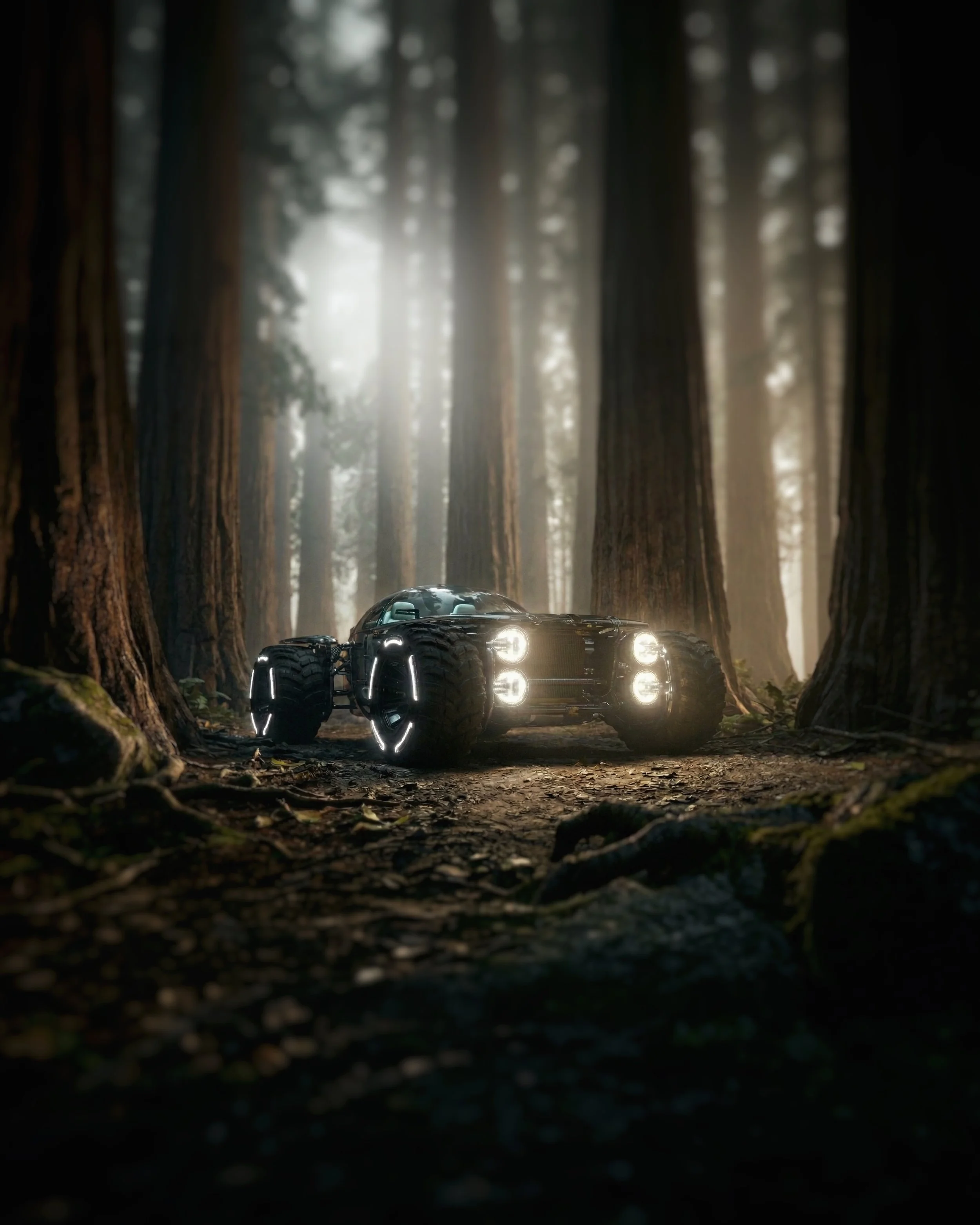 This car is built for exploration, venturing deep into a forest of towering, dark trees. Surrounded by a quiet, mysterious calm, it pushes further into the unknown, a symbol of curiosity and courage, guided by shadows and the thrill of discovery.